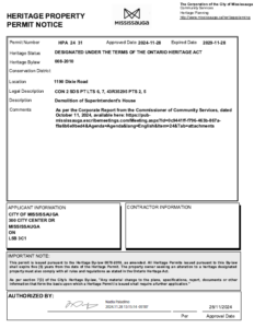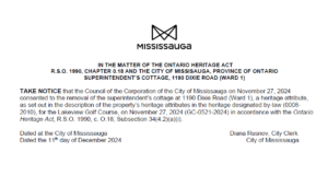A Public Notice titled “Notice of Demolition of the Superintendent’s Cottage – 1190 Dixie Road (Ward 1)”, issued under subsection 34(4.2)(a)(i) of the Ontario Heritage Act, was published on December 11, 2024.