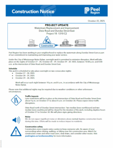 For the watermain construction project 18-1310 C2, some upcoming work will be completed outside normal business hours. This work will take on the nights of Monday October 27 to Tuesday October 28, Tuesday October 28 to Wednesday October 29 and Wednesday October 29 to Thursday October 30, 2025, between 10:00 pm and 8:00 am at the intersection of Dixie Road and Dundas Street East.