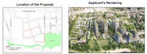 The applicant is proposing to permit an increase in dwelling units and building heights of three development blocks and to alter several by-law regulations including parking, landscaped areas, amenity space.