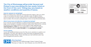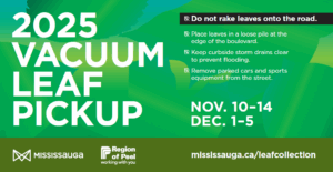 Residents who miss their leaf pickup dates, or who still have leaves to collect after the program has ended in their zone, should rake their leaves into open reusable containers or paper yard waste bags and place them curbside for pick up by the Region of Peel.